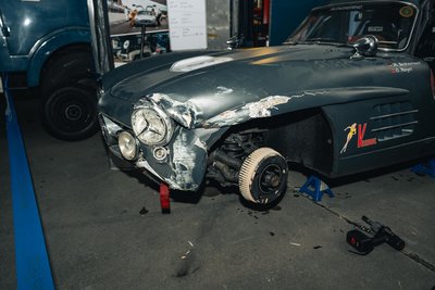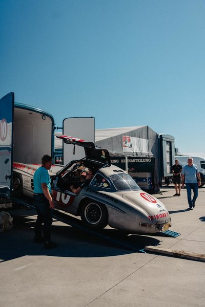 beiden historischen blauen Renntransportern bei uns die beiden Rennflügeltürer (unseren grauen und den von Christian Pfessdorf) und den sagenhaften SLS Special von Dr. Lehr.