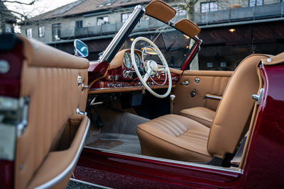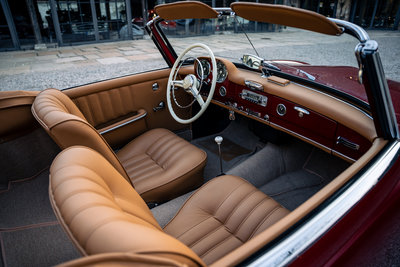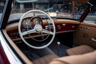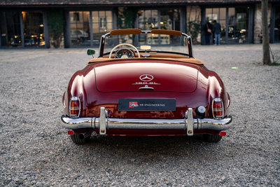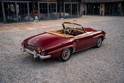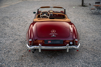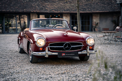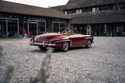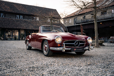 NEUZUGANG!!! Highlights: • wunderschön und vollständig restaurierter Mercedes-Benz 190 SL aus dem Jahr 1959. • aufwendig beim deutschen Fachbetrieb "frame-off" restauriert, belegbar mit zahlreichen Bildern. • äußerst geschmackvolle Farbkombination in dunkelrot mit braunem Leder-Interieur inklusive Kofferset in Lederfarbe. • im Oktober 1959 an das Rockefeller Center nach New York, USA geliefert. • begehrte "matching numbers" Dieses Fahrzeug wurde im Oktober 1959 an seinen ersten Besitzer in Amerika ausgeliefert. Bei seiner Rückkehr nach Europa wurde der 190 SL ab 2014 komplett restauriert. Der Zustand ist exzellent, was die Fotos nur unvollkommen wiedergeben können. Technik und Optik des 190 SL präsentieren sich so, dass sie als neuwertig zu bezeichnen sind. Zwischenverkauf und Irrtümer für dieses Angebot sind ausdrücklich vorbehalten. Ausschlaggebend sind einzig und allein die Vereinbarungen im Kaufvertrag.