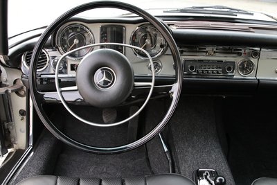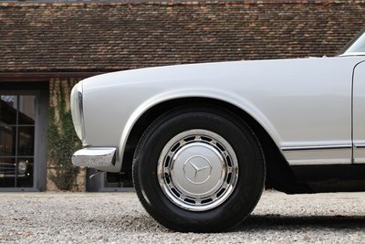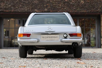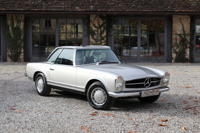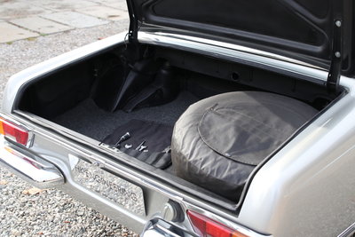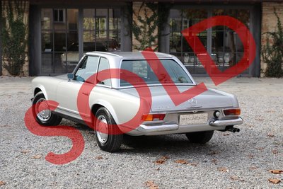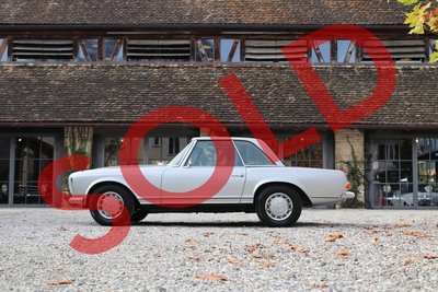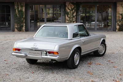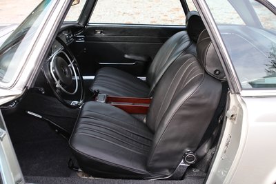This beautiful 280SL Pagoda was delivered in 1970 to its first owner in the USA, where the roadster will remain until 2016. Due to the very good substance of the body and technology the new owner decided to import it to Austria. There the pagoda was restored, the work carried out included a new paint job on bare metal in the classic silver-grey metallic DB180 as well as black leather upholstery and newly refurbished chrome. The soft top was reupholstered in black and the hardtop was restored. All wearing parts have been renewed as well as new tubes, tyres, steering, shock absorbers, seals and much more. The compression values of the engine are excellent! The automatic transmission including transmission converter and the injection pump have also been overhauled and are working perfectly. Get this completely overhauled pagoda with great driving values.