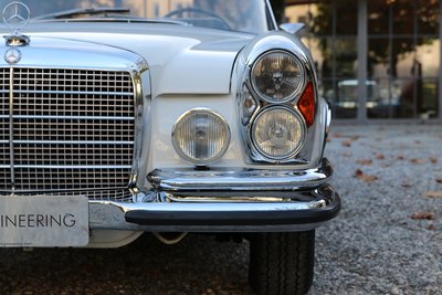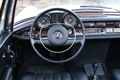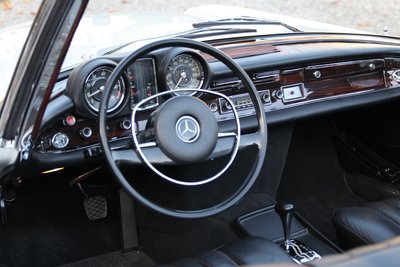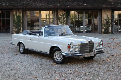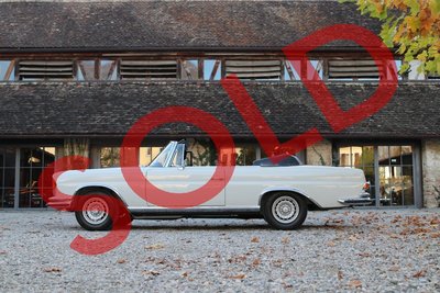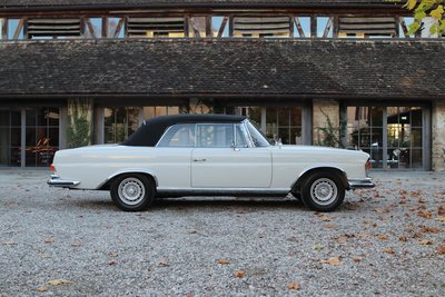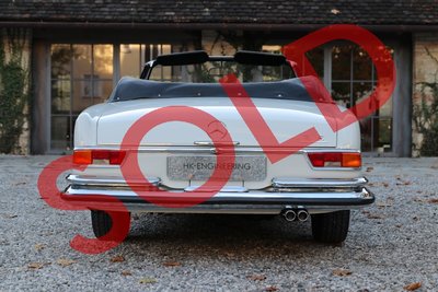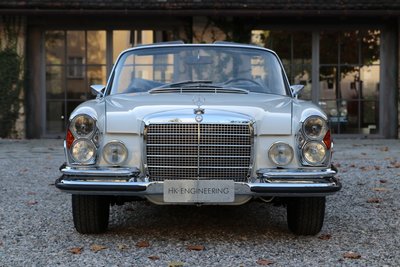 We offer a completely restored and very rare German 1970 Mercedes-Benz 280 SE 3.5 Convertible (altogether only 1232 vehicles produced) in the original factory combination papyrus white paint combined with black leather interieur and black soft top. According to the present data card, individual seats, an automatic transmission with middle shift, halogen lamp unit, additional halogen fog lights and a black soft top have also been ordered. The first delivery took place on 6th March 1970 to the first owner to Hamburg, Germany. There, the car remained until 2015 before it was completely restored by a specialized Mercedes-Benz restoration company. Due to the excellent substance and the total mileage of only 131,000 kilometers, the preservation of originality was of the utmost importance. For example, The interior has been carefully prepared and is in perfect original condition. The old vehicle registration document is available as well as the complete restoration documentation. Secure this dreamlike W111 Convertible with coveted matching numbers, new Tüv and H-approval.